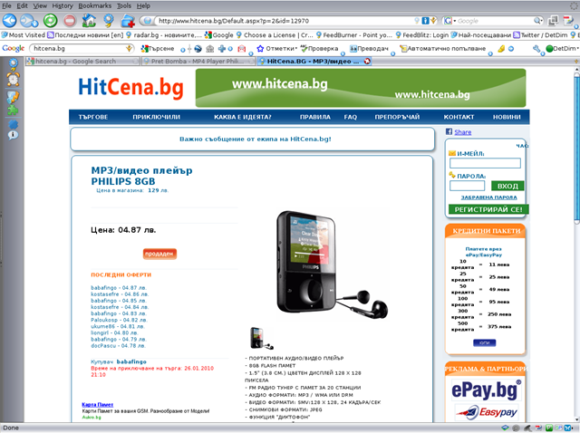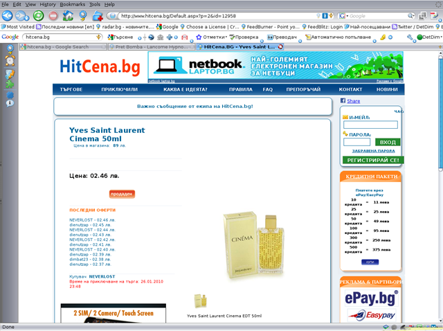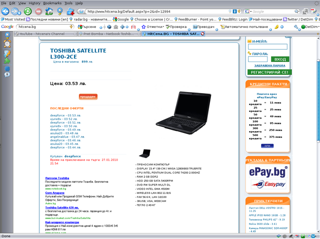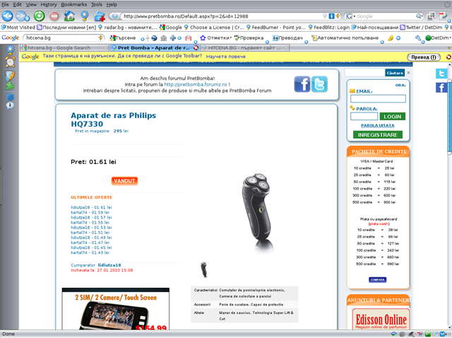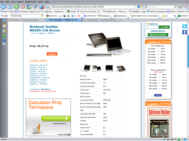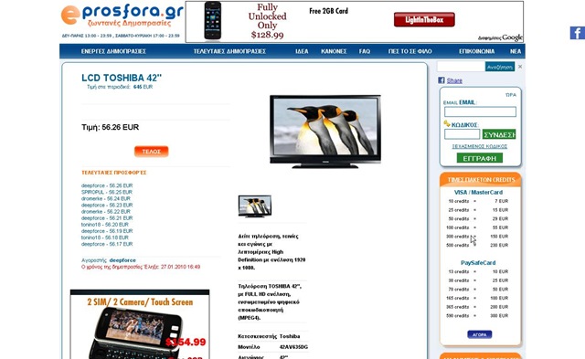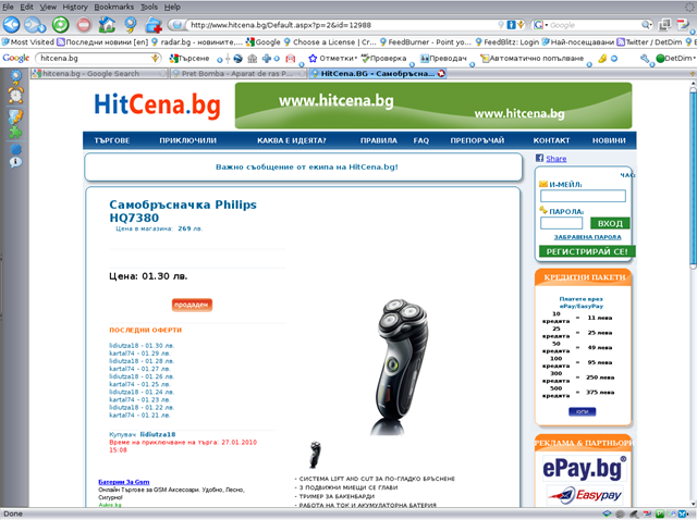 От доста време се лутам из интернета и какво търся по разни аукциони и аз не знам.Ровя тук, ровя там и попадам на един сайт дето ама “голям късмет извадих”, техника за левчета.Примерно телевизор – голям 42″ за 56,26 лева. Ехаааа.
