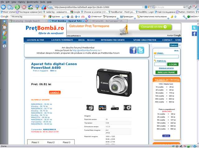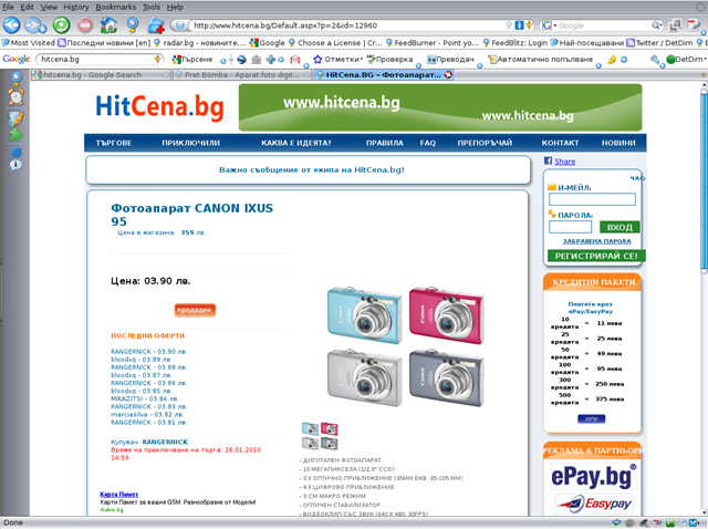 Гледам смятам, цяла вечер не мога да спя, и как и да го гледам и смятам абе ако спечелиш търг, все си на далавера.Па смятам кога е най-добре да залагаш в колко часа, и на кое най-малко се мятат хората. Насмятах се, намятах се ама пак нещо ме гложди, не може то тука да няма и няк’ва друга врътка. Наясно съм вече, че цената под телевизора 56,00 лв. е 5600 лв. които фирмата организирала търга вече е лапнала ама това пък си е нейна работа. В условията си е написала – Срещу един кредит можете да наддавате веднъж. Всяко следващо наддаване Ви струва нов кредит. Кредитите, използвани от участниците за наддаване в търга, не се възстановяват в акаунтите им. Който е чел, чел да си смята.